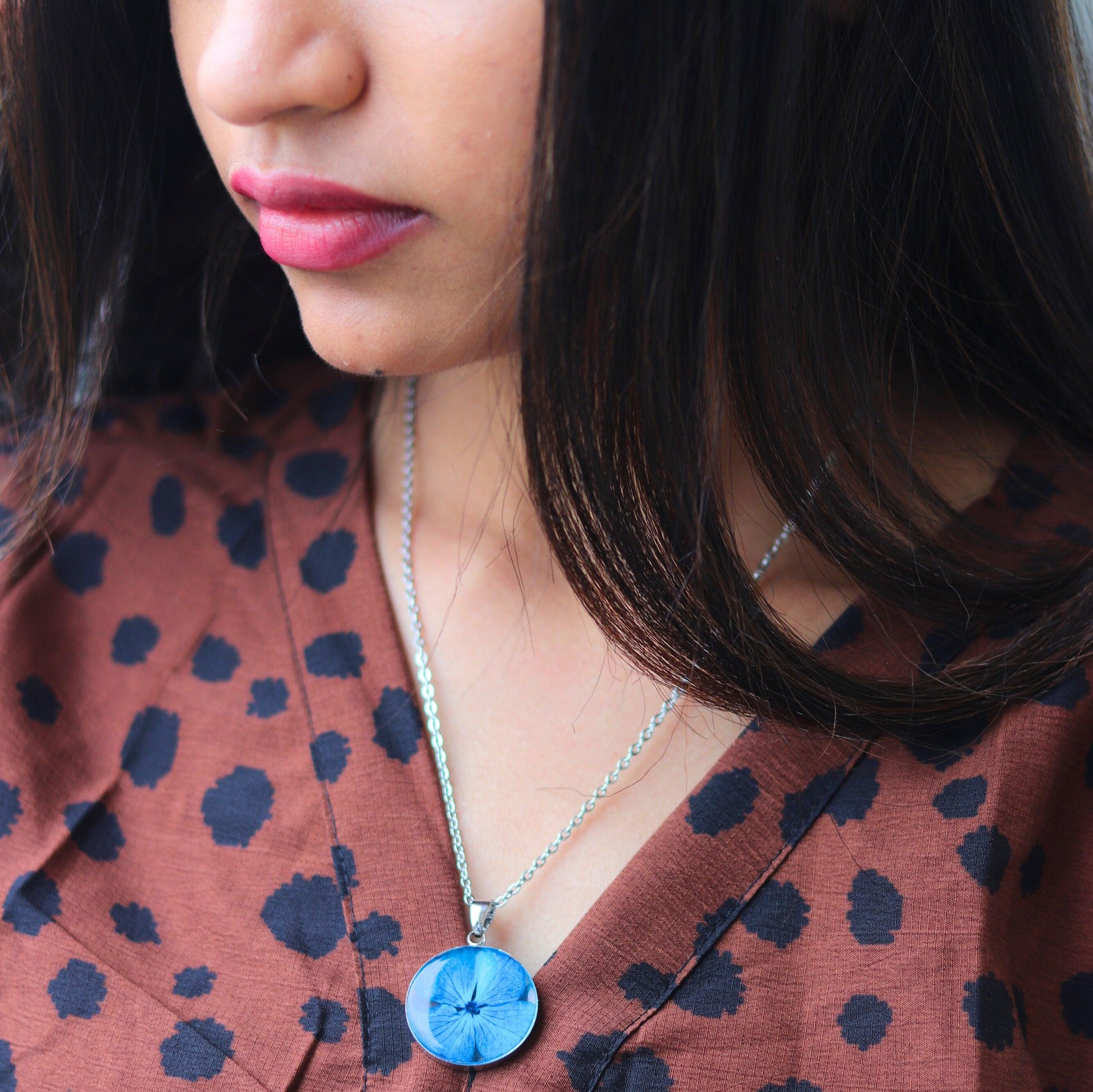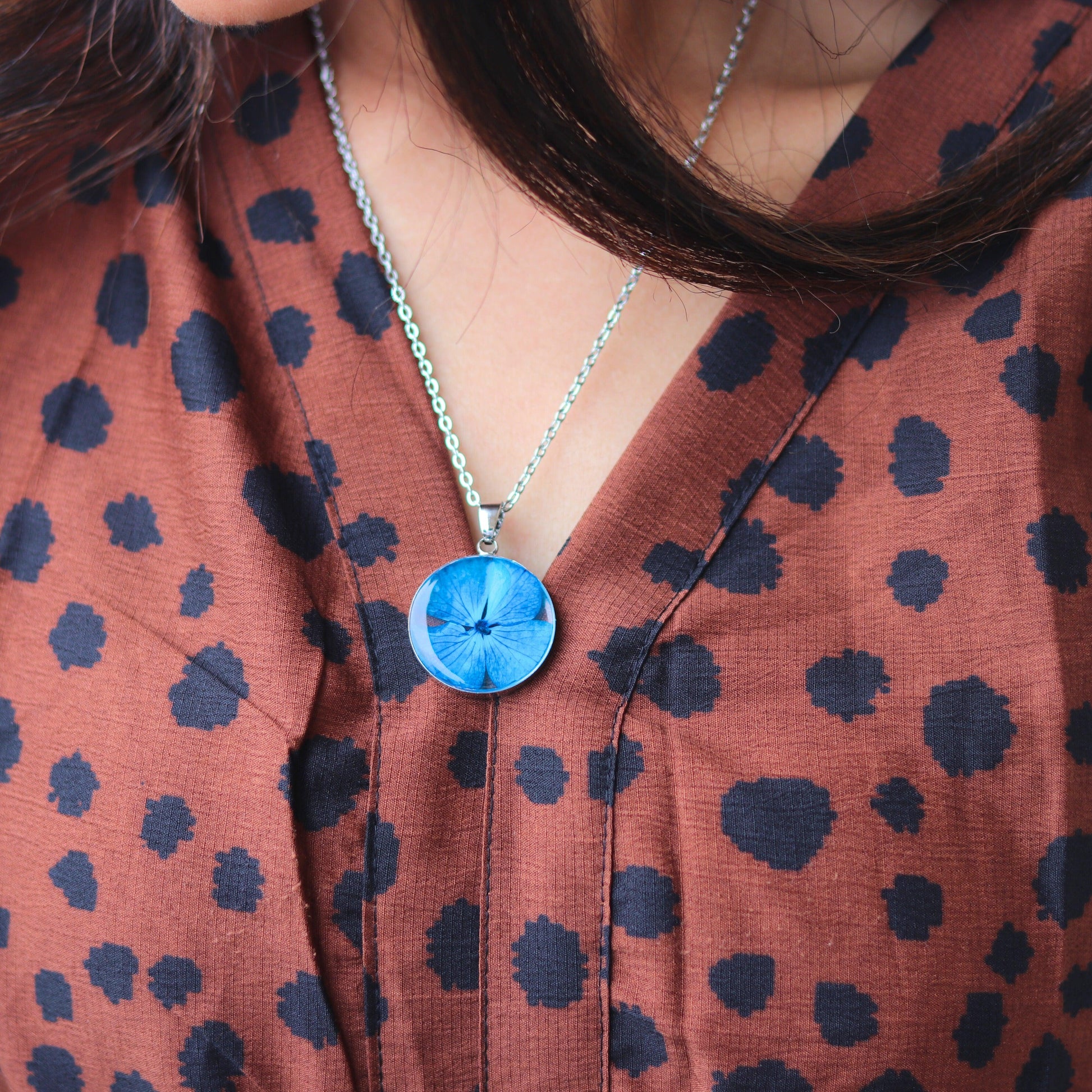- Real Flower Jewellery: This necklace features a genuine blue hydrangea flower, offering a unique and authentic touch in the world of real flower jewellery.