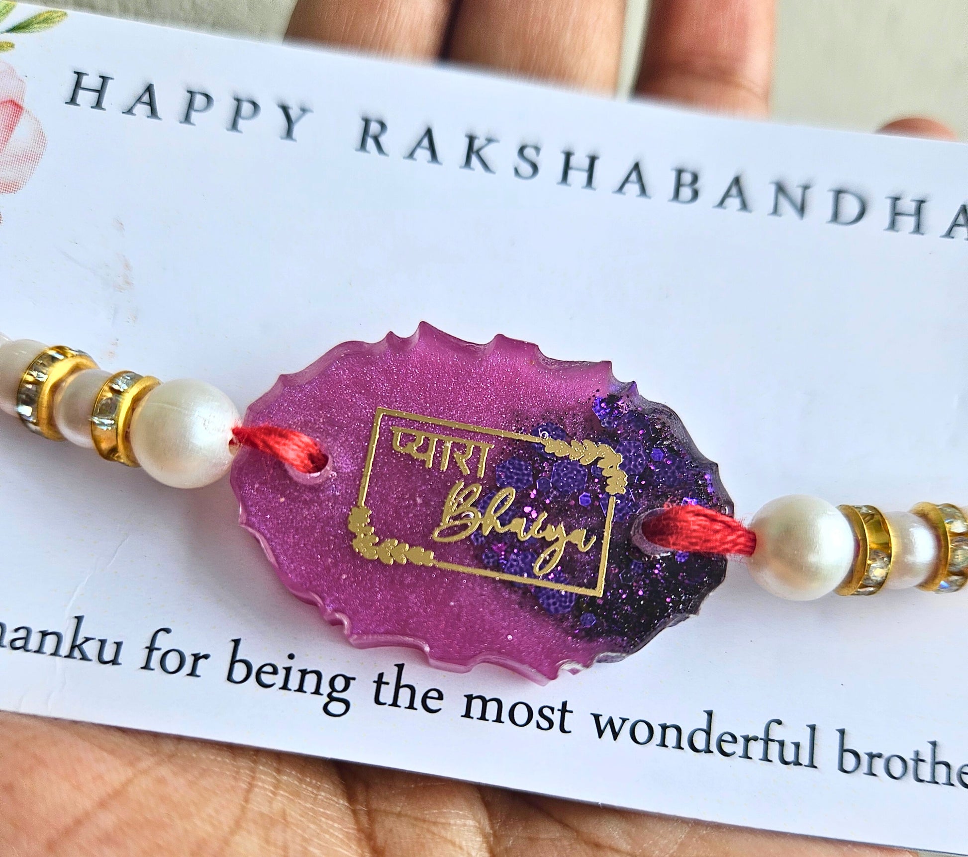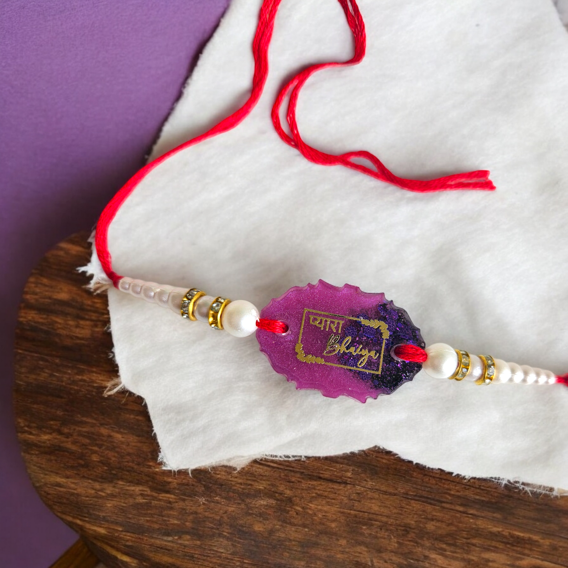 Celebrate the special bond with your brother this Raksha Bandhan with our Enchanted Pink & Purple Pyara Bhaiya Rakhi. This exquisitely crafted rakhi features an oval shape encapsulating a stunning blend of dark pink and purple resin, enhanced with shimmering golden flakes. Inside the bezel, the affectionate words "प्यारा Bhaiya" are elegantly inscribed in golden script, adding a personal and heartfelt touch.