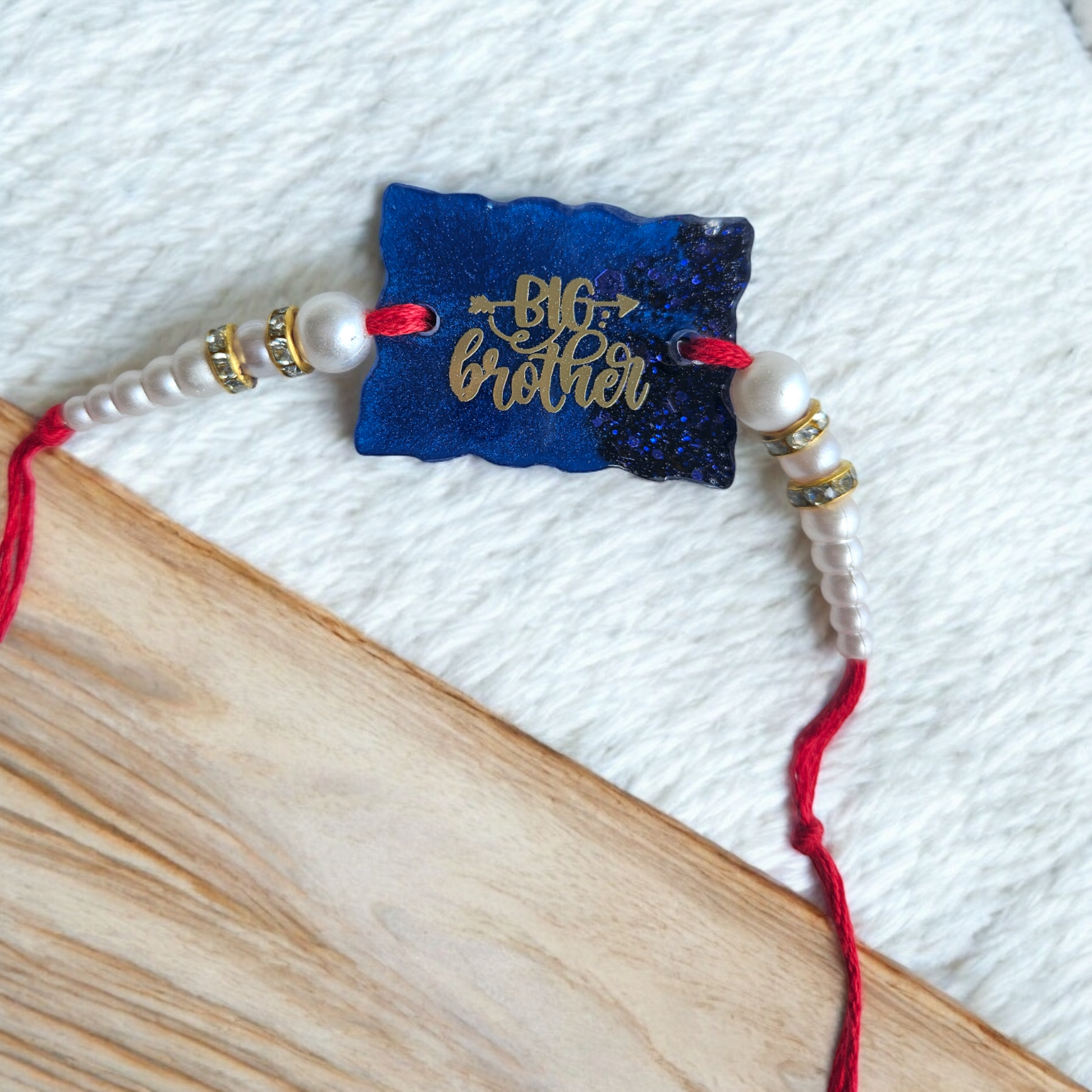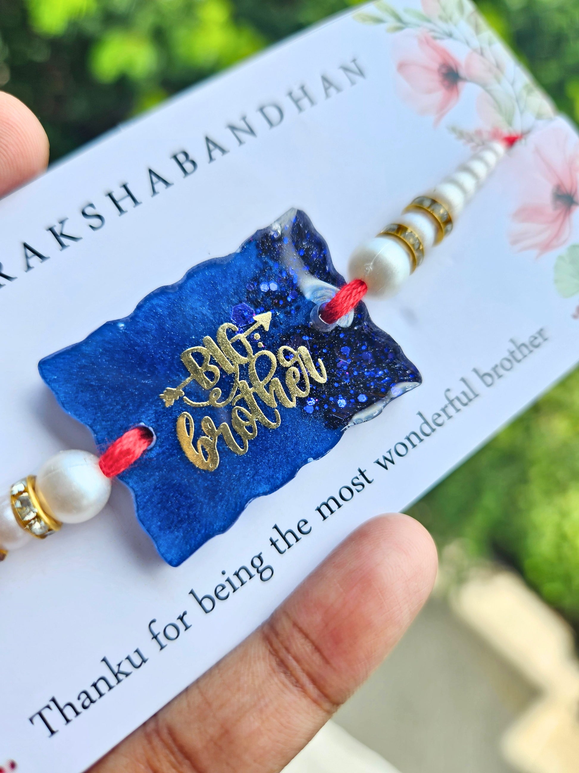 Celebrate Raksha Bandhan with our striking Midnight Blue Big Brother Rakhi. This elegant rakhi features a rectangular golden bezel, encapsulating rich dark blue resin adorned with matching dark blue flakes for a sophisticated touch. Inside the bezel, "Big Brother" is inscribed in golden script, adding a personal and heartfelt sentiment.