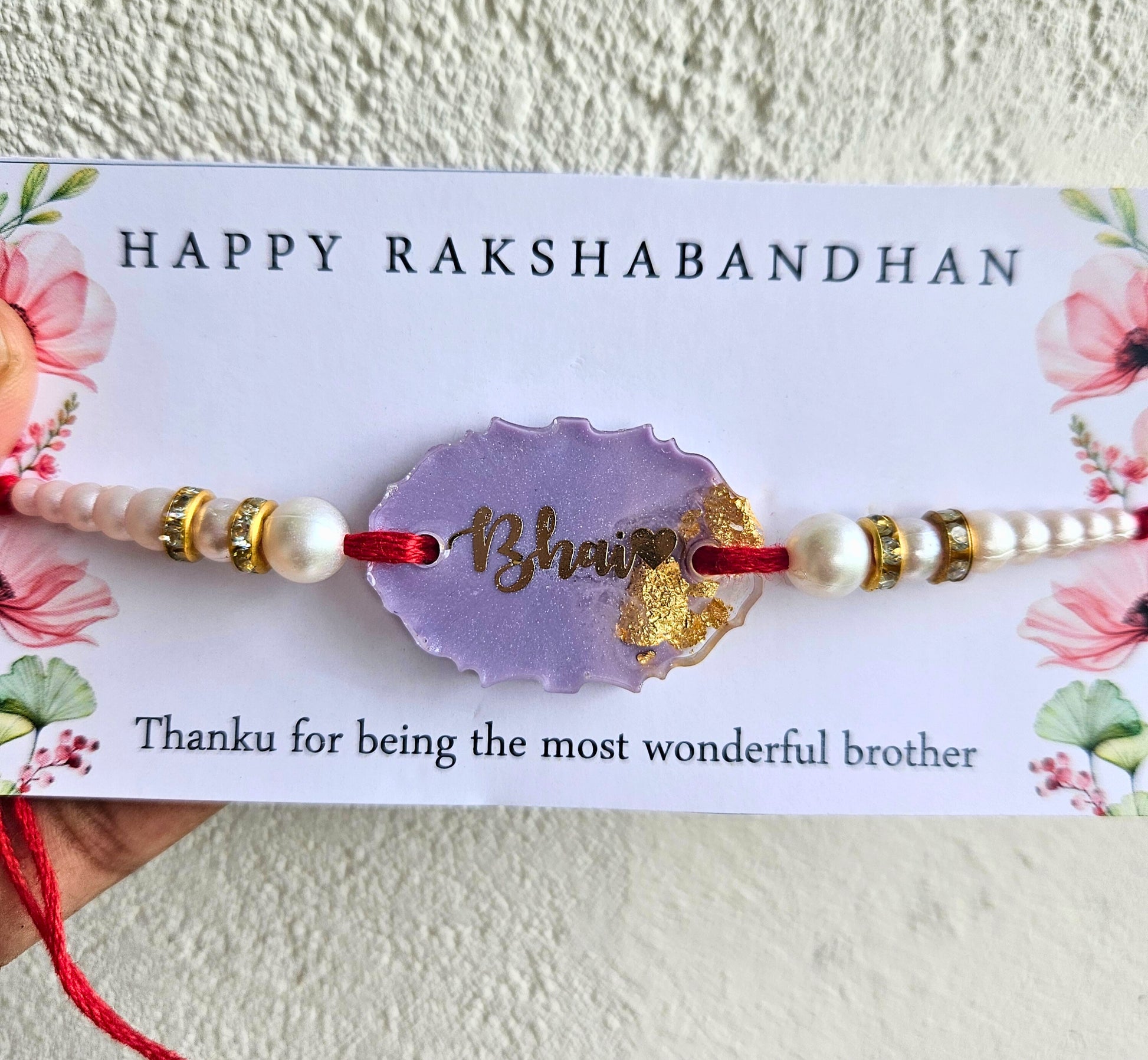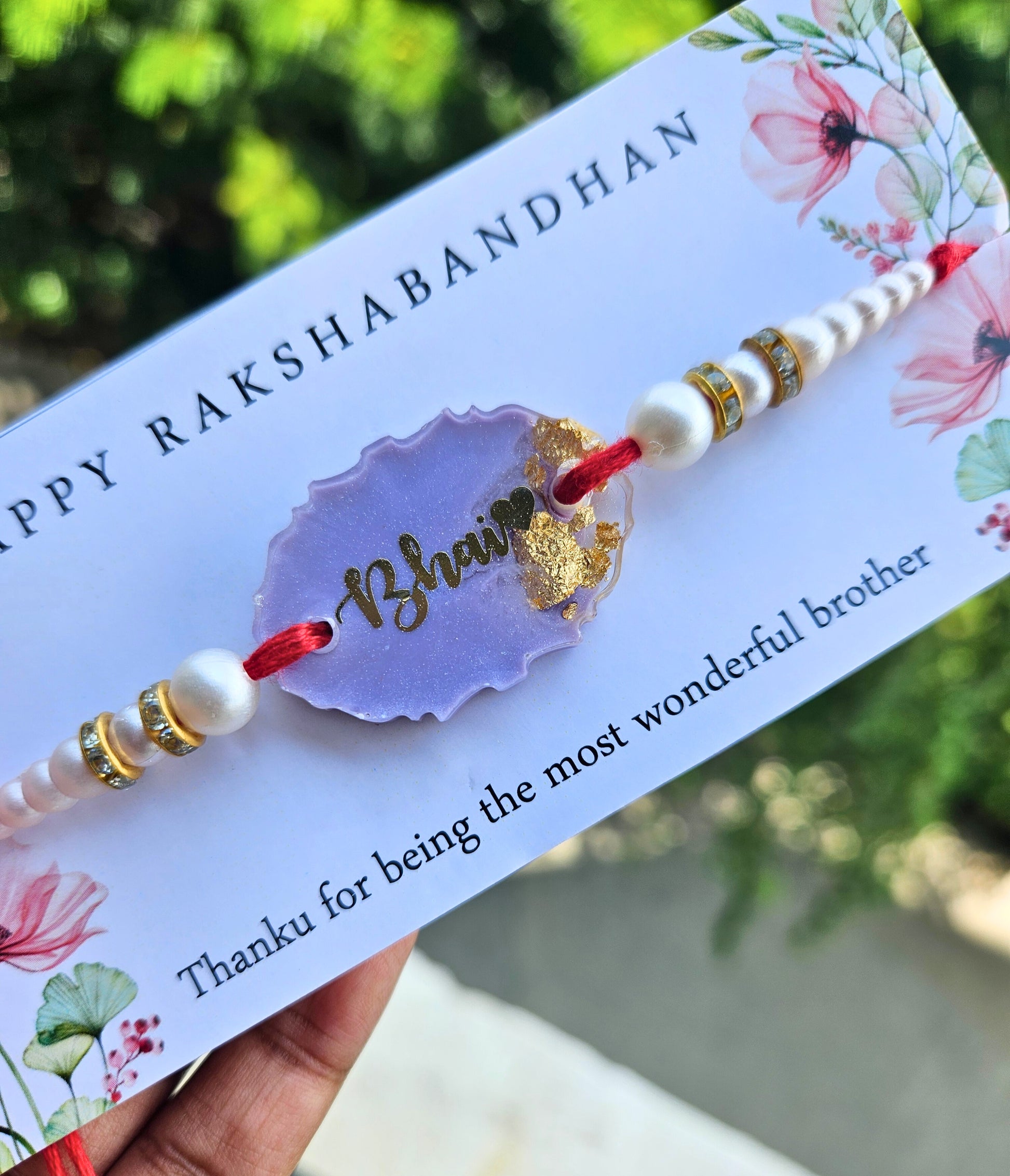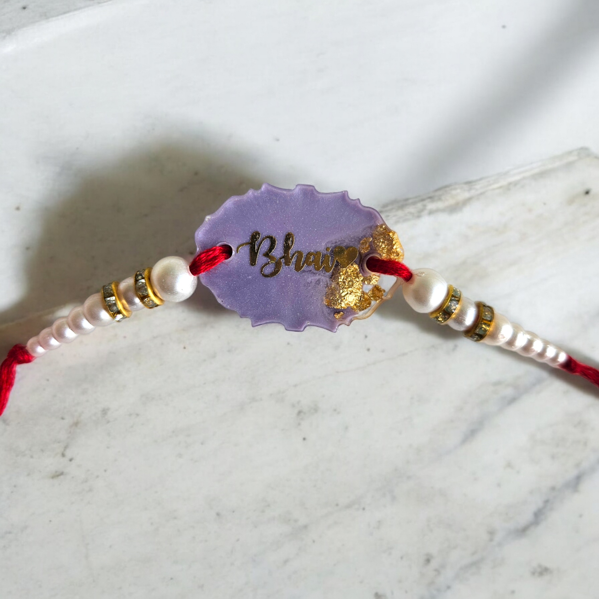 Celebrate Raksha Bandhan with our exquisite Pastel Lavender Bhai Rakhi. This beautifully crafted rakhi features an oval rakhi that encapsulates a delicate pastel lavender resin adorned with shimmering golden flakes. Inside the bezel, the word "Bhai" is elegantly inscribed in golden script, adding a personal and heartfelt touch.