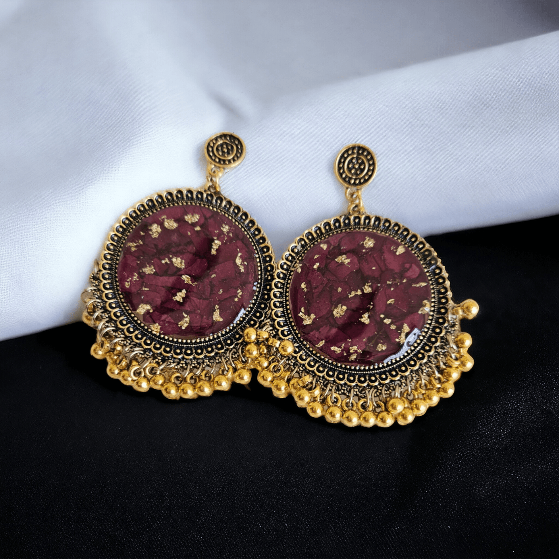 Introducing our exquisite Rosette Dangle Jhumka, a fusion of timeless elegance and contemporary sophistication. Each pair is meticulously handcrafted, featuring delicate real rose petals preserved within a radiant gold-colored bezel, adorned with intricate gold foils for a touch of opulence.