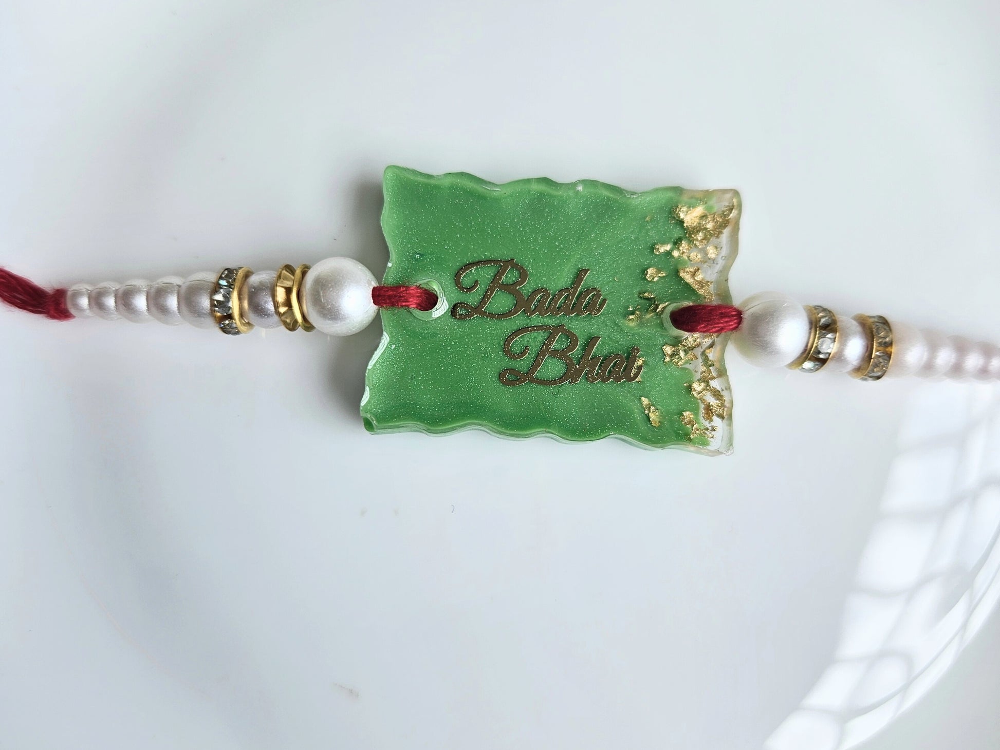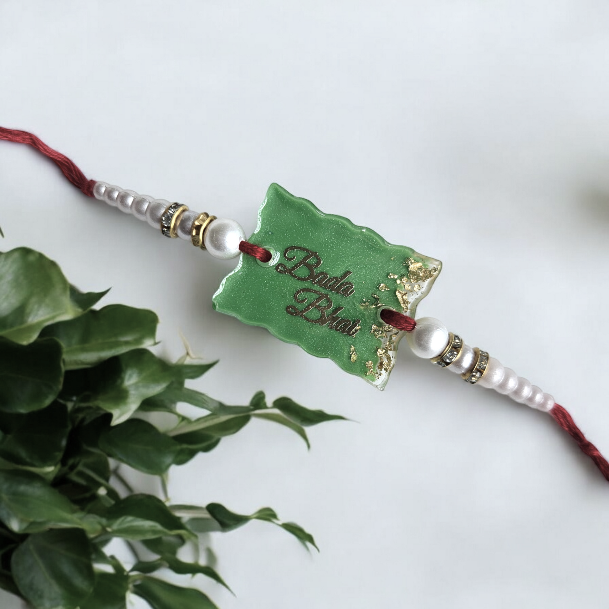 Celebrate Raksha Bandhan with our charming Serene Green Bada Bhai Rakhi. This beautifully designed rakhi features a rectangular shape rakhi encapsulating soft pastel green resin with elegant golden flakes for a touch of sophistication. Inside the bezel, the words "Bada Bhai" are inscribed in golden script, offering a personal and affectionate touch.